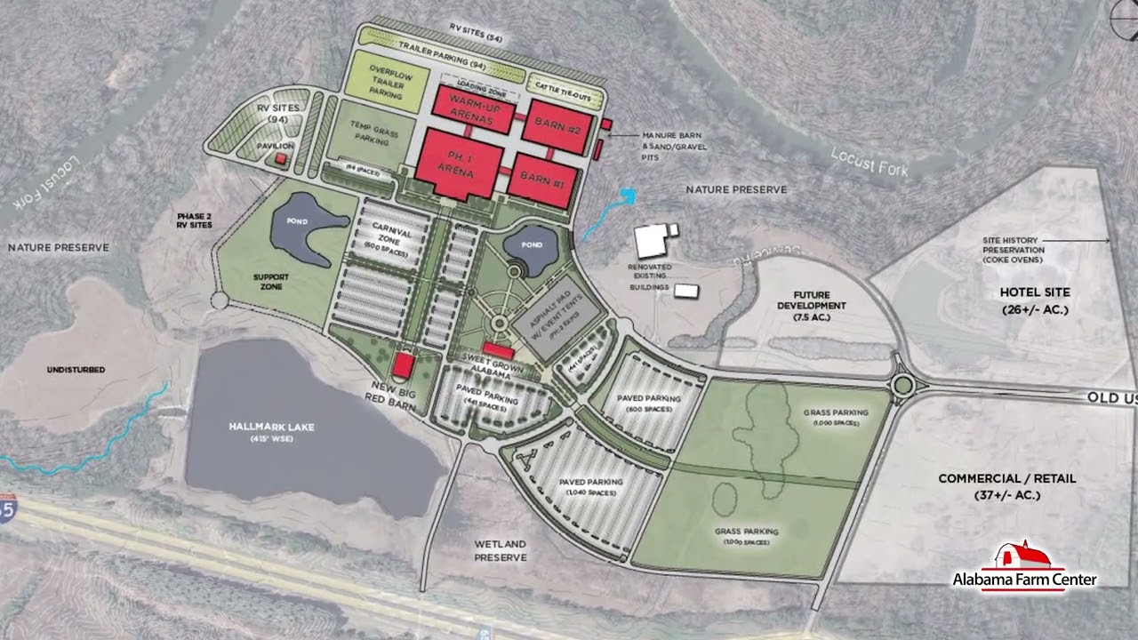 Once reclaimed, the site will host the Alabama Farm Center, featuring facilities for livestock shows, rodeos, educational programs, and an annual state fair, with an estimated $2.2 billion in direct economic impact over 20 years and the creation of up to 850 jobs.
