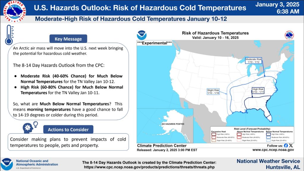 HUNTSVILLE – The National Weather Service in Huntsville is urging North Alabama businesses and residents to prepare now for potential dangerously cold temperatures next week. In an update Friday morning, […]