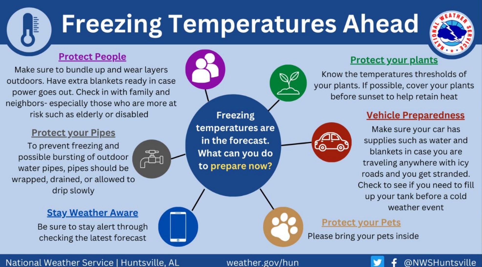 The National Weather Service urges residents to take steps to protect people, pets, plants and pipes during the prolonged cold spell. Pipes are particularly vulnerable to freezing when temperatures fall into the teens or lower.
