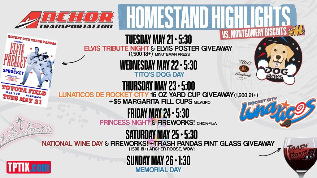 MADISON – The Rocket City Trash Pandas, coming off their first back-to-back pitching shutouts in club history, return home for a six-game homestand tonight through the Memorial Day weekend. Rocket […]