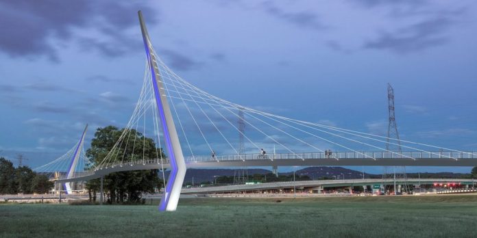 The project includes a 1,400-foot long suspension bridge over Memorial Parkway and improving the Pinhook Creek area through excavation, channel work and new bridges.