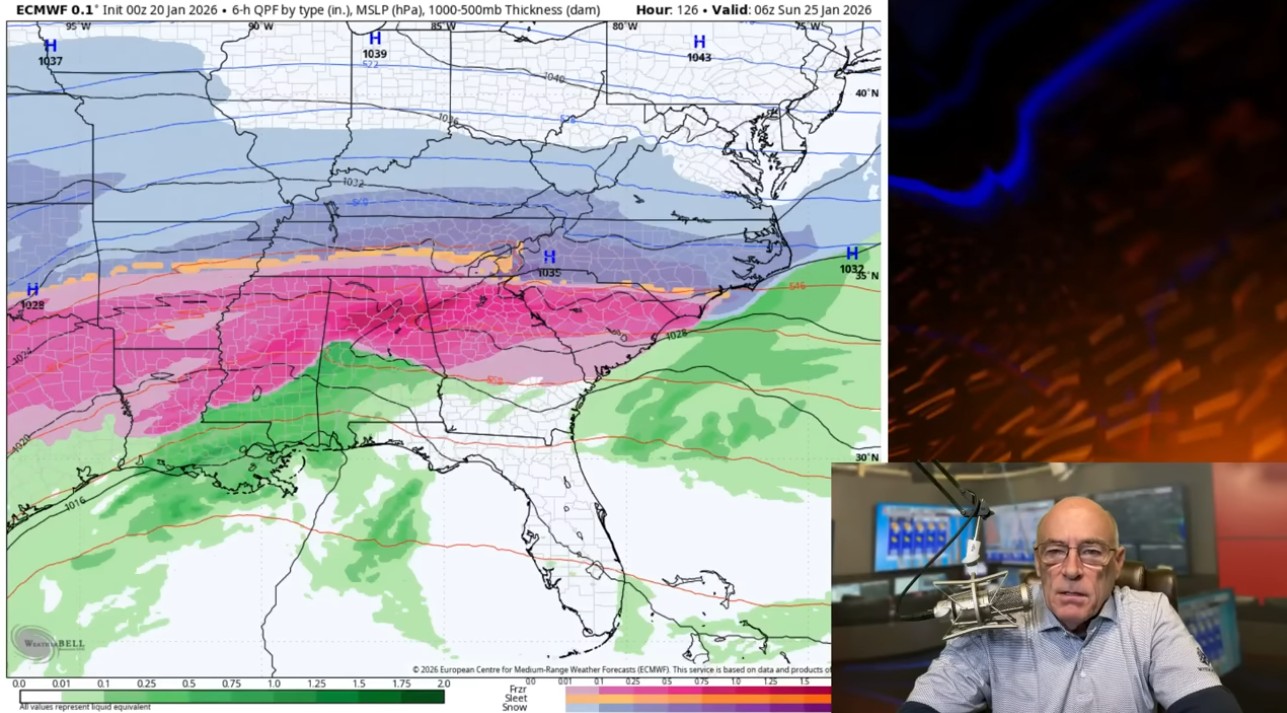 *South of the Tennessee River, an extended period of freezing rain seems likely due to the cold air being very shallow. This is precipitation that falls in liquid form when temperatures are at or below freezing. This leads to ice accumulation on exposed surfaces and can bring potential for power outages and very difficult travel conditions. Global models continue to suggest potential for some very significant ice accumulation.