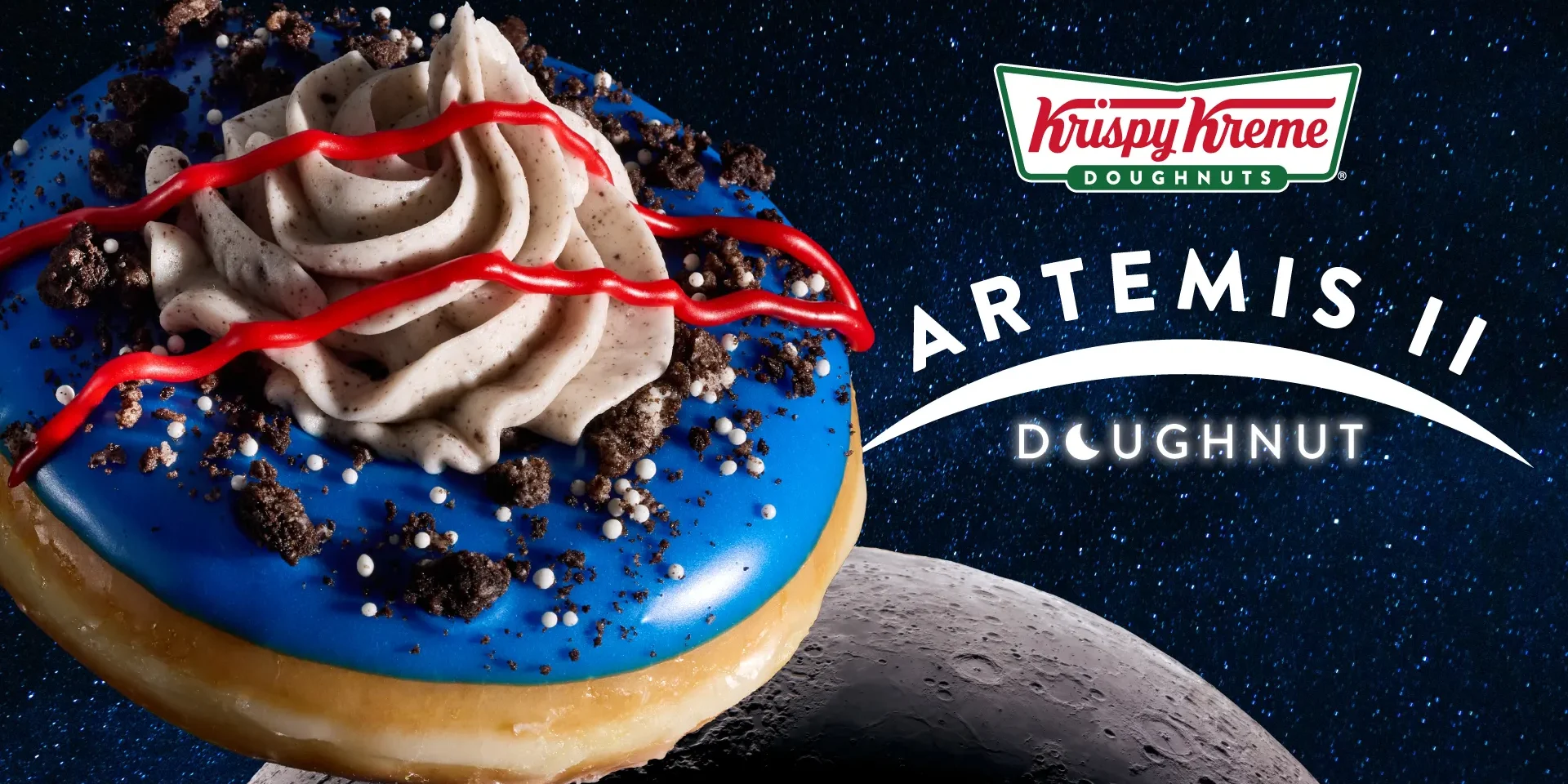 Built on the brand’s Original Glazed® doughnut, the Artemis II Doughnut features blue vanilla-flavored icing, OREO® cookie pieces, white sprinkles, a cookies-and-cream buttercream dollop and a red chevron design inspired by NASA’s iconic logo. The item is also included in an Artemis II Specialty Dozen alongside classic Original Glazed® doughnuts.