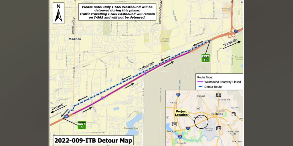 The closures will be due to the city of Madison’s project to construct the westbound interchange (Exit 10) at Town Madison on I-565.