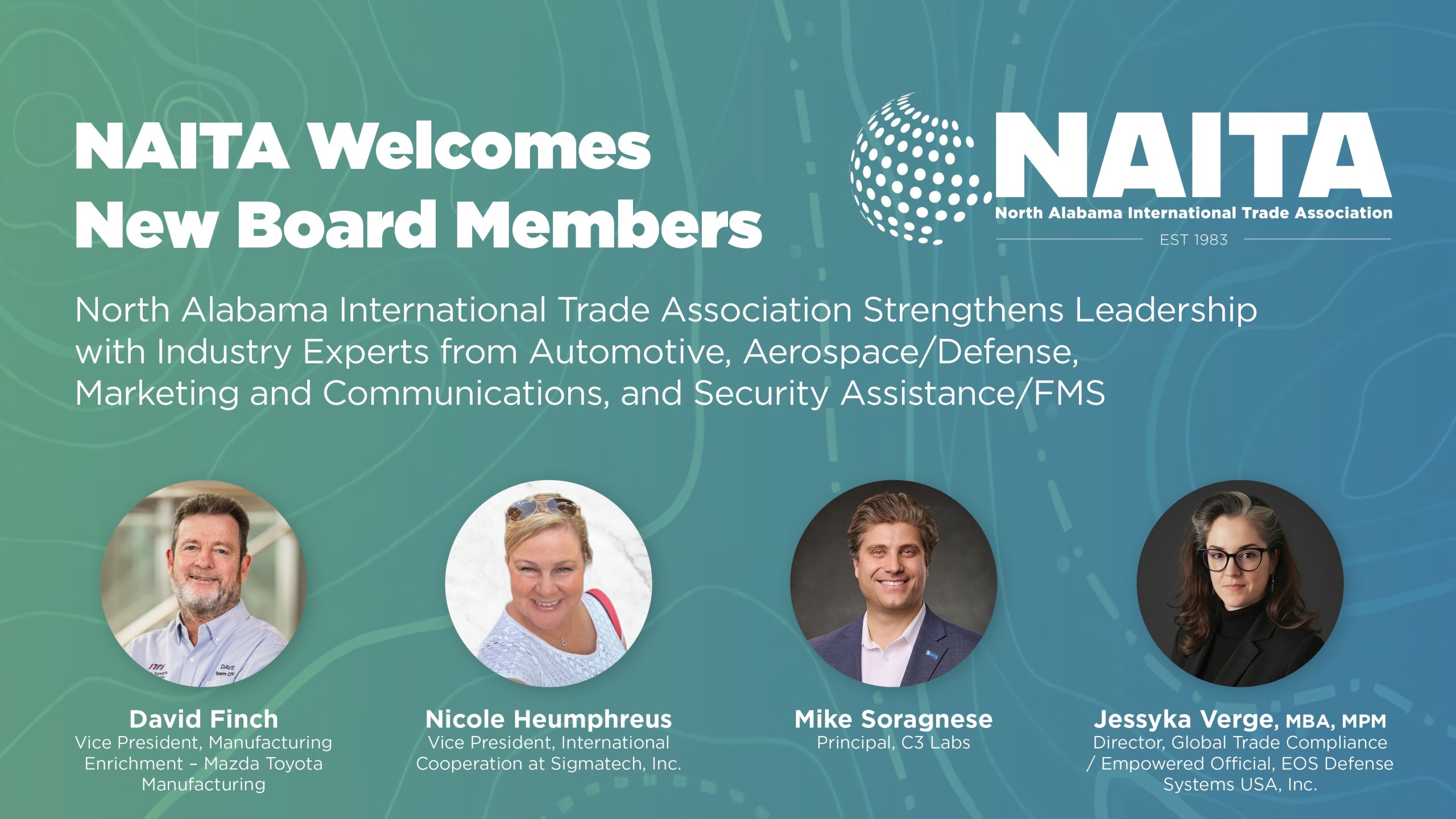 The North Alabama International Trade Association has appointed four new members to its board of directors, adding leadership from the automotive, aerospace, marketing and defense sectors.