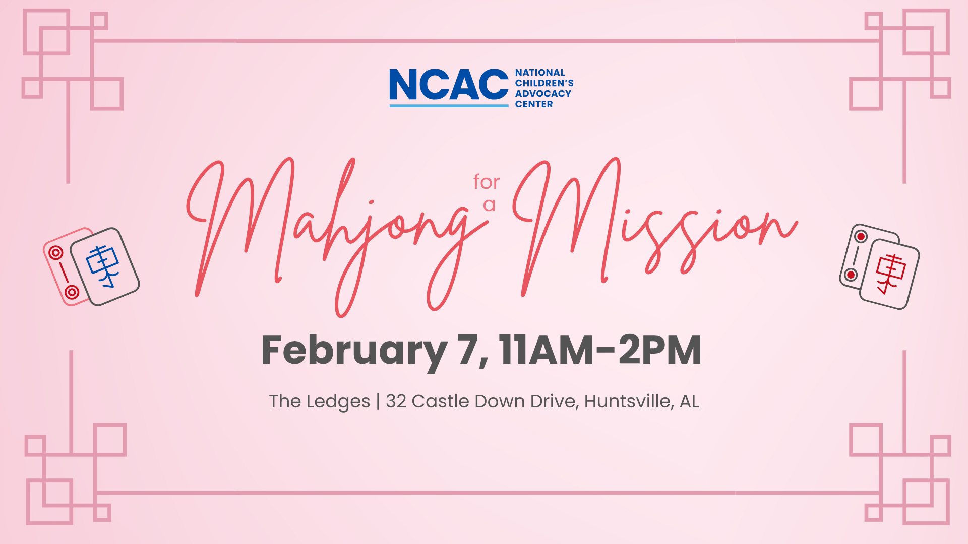 The Galentine’s-style brunch event is scheduled for Saturday, Feb. 7, 2026, at 11 a.m. at The Ledges in Huntsville. Organizers say the tournament will feature mimosas, social play and three games of American-style Mahjong, all in support of NCAC’s mission to strengthen the response to child abuse.