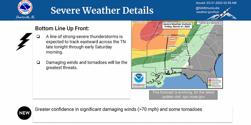 HUNTSVILLE — The National Weather Service isn’t pulling any punches with its forecast for tonight and Saturday. The Weather Service’s Huntsville office is calling for “significant damaging winds (greater than […]