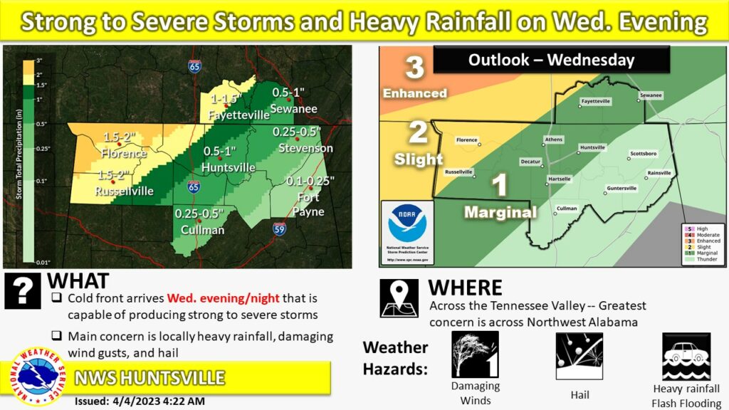 HUNTSVILLE — A cold front Wednesday night could bring showers, and even storms, to the Tennessee Valley, according to the National Weather Service’s Huntsville office. “Strong to severe storms are […]