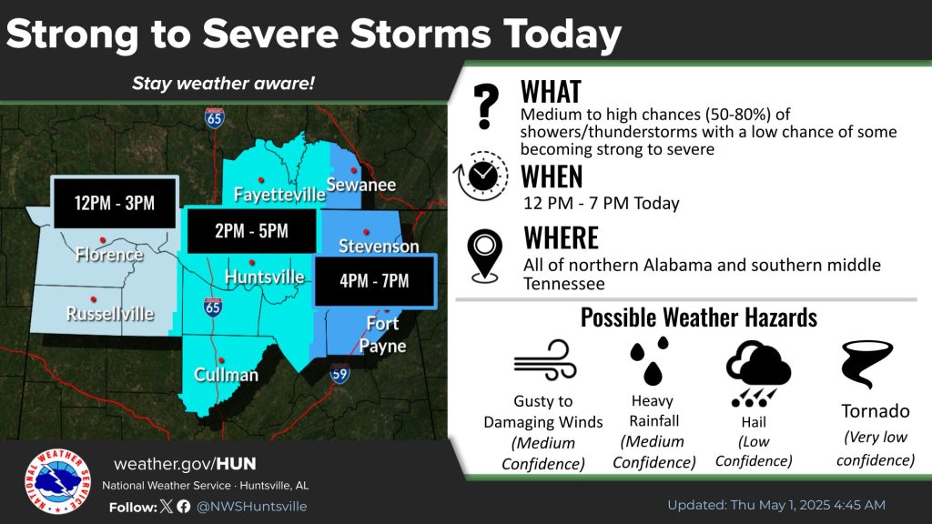 HUNTSVILLE — There is a possibility of severe weather on the drive home from work today, according to the National Weather Service Huntsville office. The office said a low to […]