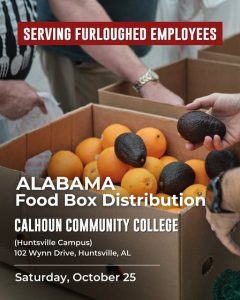 OneGenAway’s Mobile Pantry will be at the Calhoun Community College Huntsville Campus, 102 Wynn Drive, to distribute pre-boxed food Saturday from 9-11 am.