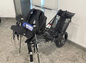 From Huckleberry Hiking, the cascade cart is designed to attach to an able-bodied hiker, who then tows the physically challenged individual (up to 150 pounds) or a child on the trails and other outdoor spaces. The cart is designed so that the lead hiker only feels 25% of the weight of the person being towed.